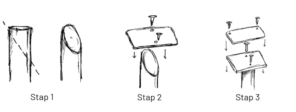 De gaatjes maken het mogelijk om het plantbordje vast te maken met tiewraps, draad of vast te schroeven op een paaltje. Hieronder zie je een voorbeeld hoe je dat kunt doen.